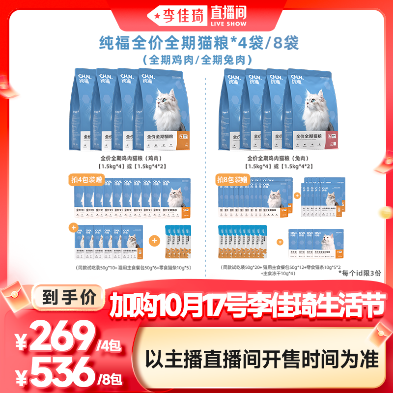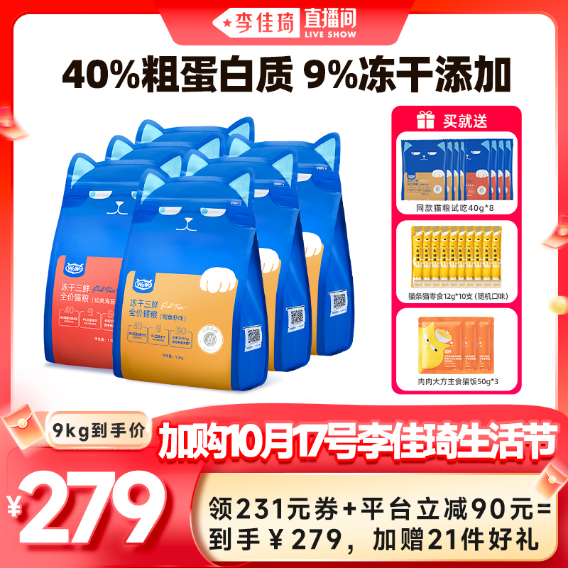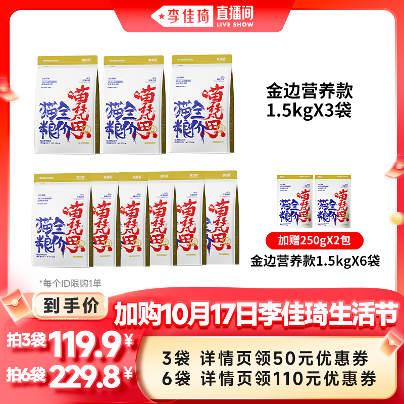 41、10月17号【李佳琦直播间生活节】喵梵思4.1金边猫粮1.5kg*3包/6包