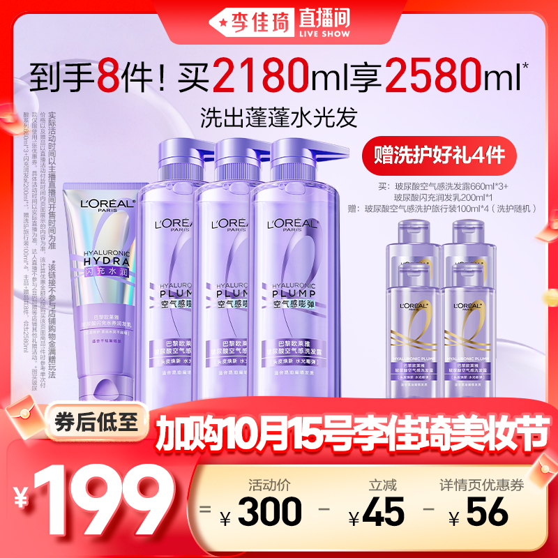 58、【加购10月15号李佳琦美妆节】欧莱雅玻尿酸洗护套装控油蓬松*
